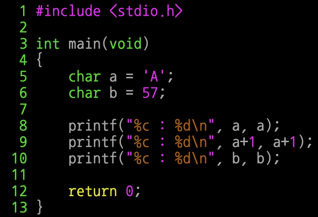 위의 예제는 문자형(char) 변수 a에 문자 'A'를 저장한 뒤에 값을 출력한다.