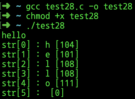 총 5바이트 크기의 공간과 마지막 NULL 문자('\0')까지 6바이트 공간을 차지하고 있음을 알 수 있다.