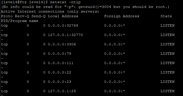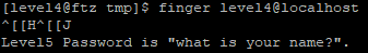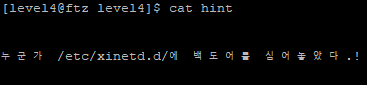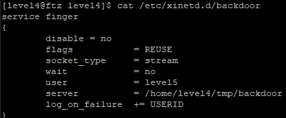 /etc/xinetd.d/backdoor 파일의 내용에서 finger 서비스로 요청이 들어오면 level5 계정의 권한으로 /home/level4/tmp/backdoor 프로그램을 실행한다고 되어있었다.
