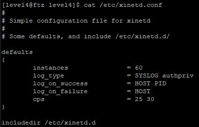 xinetd 데몬의 설정 구조를 확인하기 위해 /etc/xinetd.conf 파일을 열어보면 위와 같다.