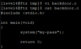 그렇다면 finger 서비스에 요청을 보내면 level5 권한을 얻을 수는 있는데 level5 계정의 비밀번호를 얻기 위해서는 backdoor 프로그램이 my-pass 명령어를 실행하도록 해야 한다.