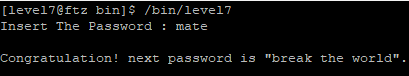 그리고 다시 level7 프로그램을 실행하고, mate를 입력하면 위와 같이 level8의 비밀번호가 뜬다.