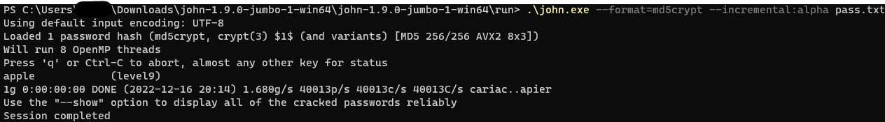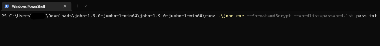 .\john.exe --format=md5crypt --wordlist=password.lst pass.txt