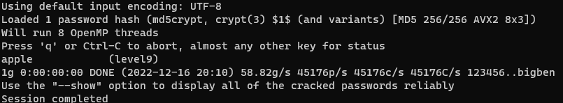level9 계정의 비밀번호는 apple인 것을 확인할 수 있다.