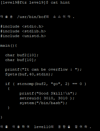 "go"가 맞다면 "Good Skill!" 문자열을 출력하고 level10 권한으로 설정 후 그 상태에서 /bin/bash 명령을 실행한다.