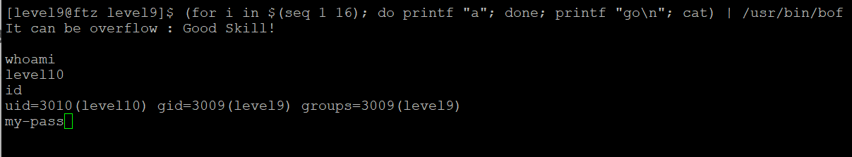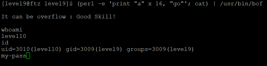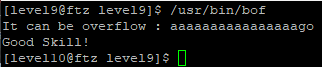 그렇다면 프로그램을 실행하고 위와 같이 'a'를 16개 써준 후 go를 입력해주면 "Good Skill!" 문자열이 뜨게 되고 level10의 셸을 얻을 수 있다.