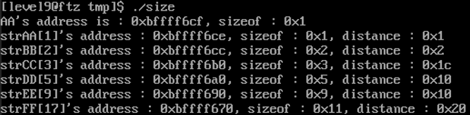 printf("strFF[17]'s address is : 0x%x, sizeof:0x%x, distance : 0x%x\n", strFF,sizeof(strFF), strEE - strFF);