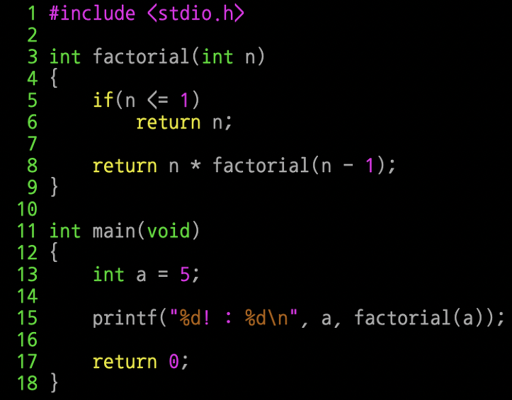 팩토리얼(factorial) 값을 계산하는 아래의 예제를 통해 재귀 함수의 사용법을 봐보자.