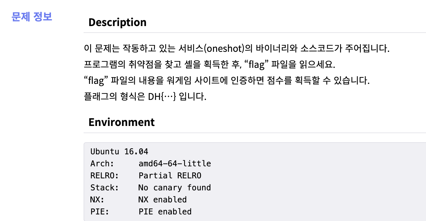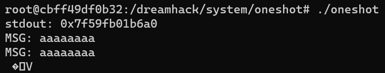 oneshot 바이너리 파일을 실행하면 stdout 함수의 주소를 알려주고, "MSG: " 문자열이 띄워진 후 입력을 받는데, "aaaaaaaa"를 입력하니 입력한 값이 그대로 출력되고 그 밑에 이상한 값이 출력된다.