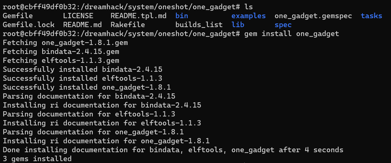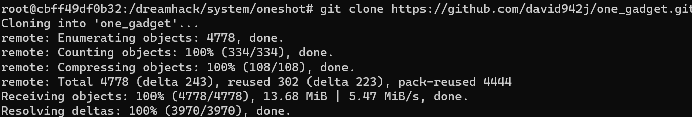 먼저 위의 명령어를 입력해 one_gadget 레포지토리를 다운로드한다.