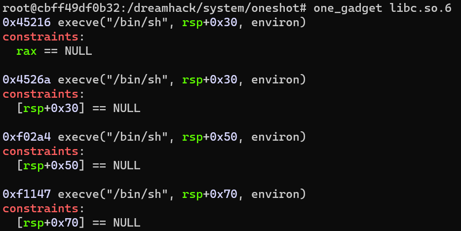 oneshot-gadget은 해당 가젯의 주소로 점프하여 호출하는 것만으로 /bin/sh이 실행되는 가젯이다.