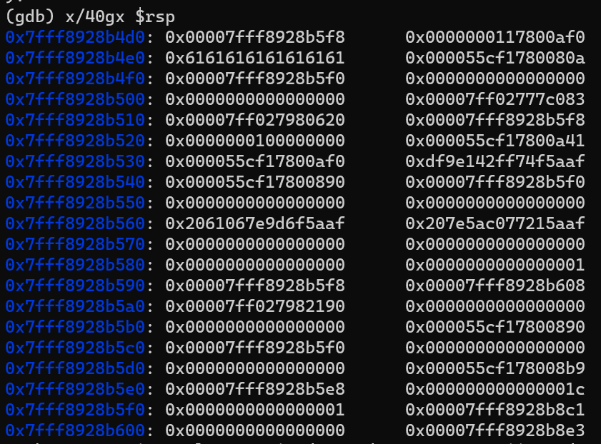 위의 사진에서 0x7fff8928b4e0 주소에 0x6161616161616161이 있다.