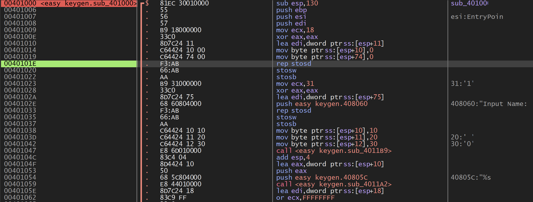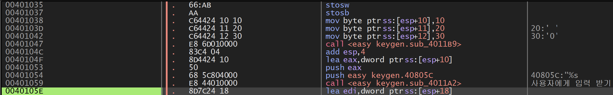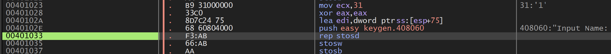 이어서 401033 주소에서 두 번째 rep stosd 명령 부분이 나온다.