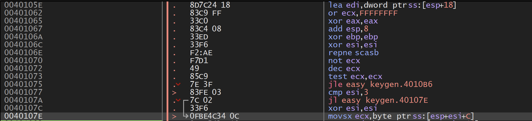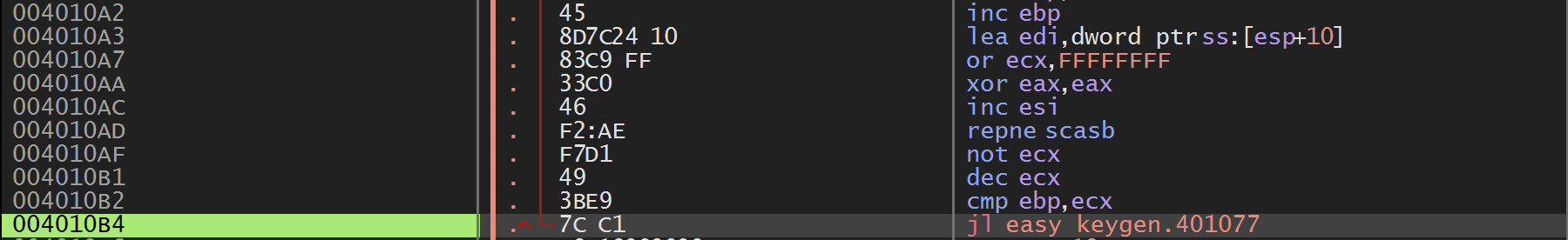 4010AD 주소의 repne scasb 명령을 수행하기 전에 4010A2 주소에서 ebp의 값을 1 증가시키는데, 이는 repne scasb 명령을 수행한 후 ecx와 비교하여 ecx의 값보다 ebp의 값이 작으면 401077 주소로 점프해 반복하라는 것이다.