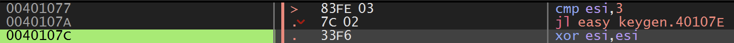 3번의 반복이 끝나고 esi와 3을 비교하는데 3번 루프를 돌면서 esi의 값이 3으로 증가되었으므로 40107E 주소로 점프하지 않고 esi 레지스터의 값을 0으로 만든 다음