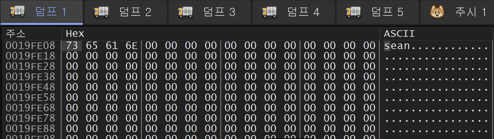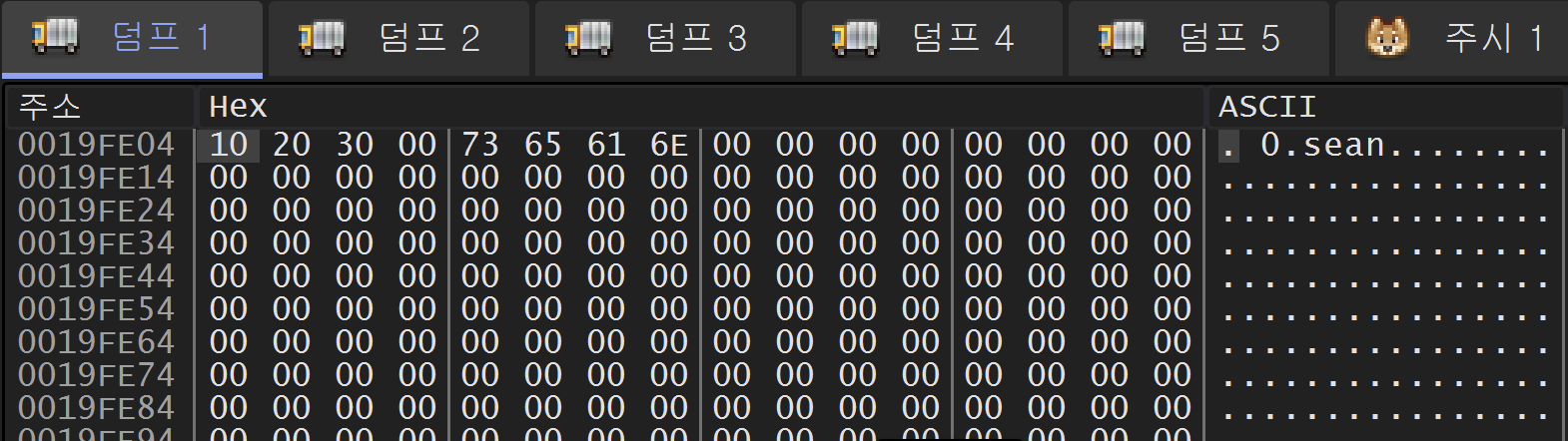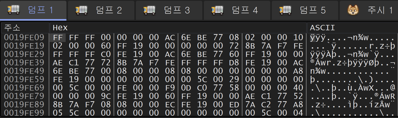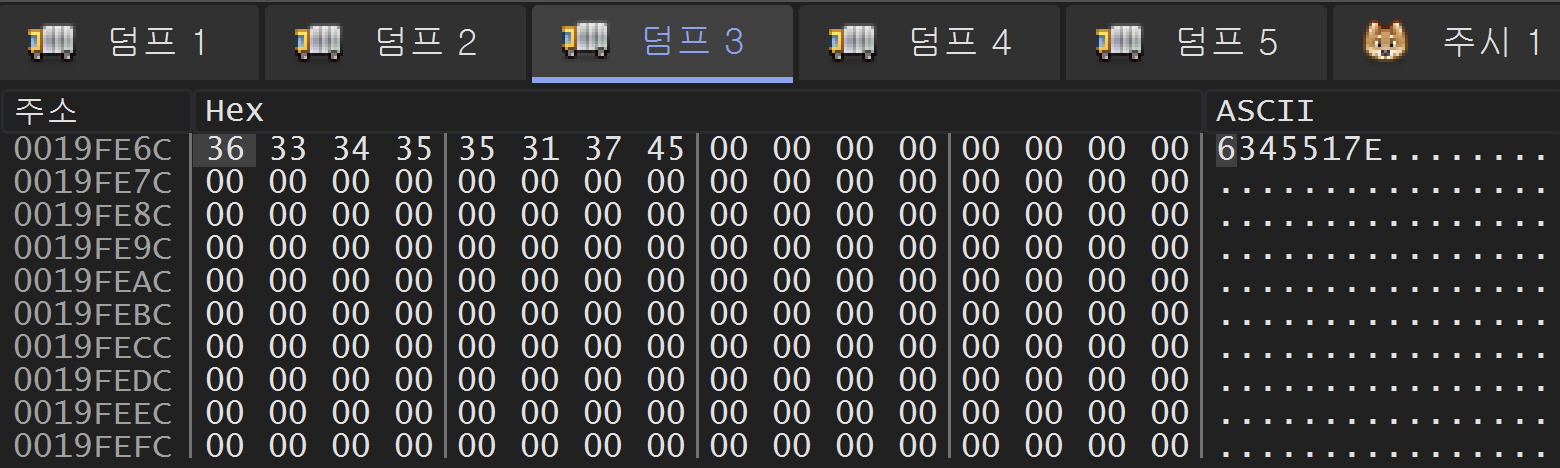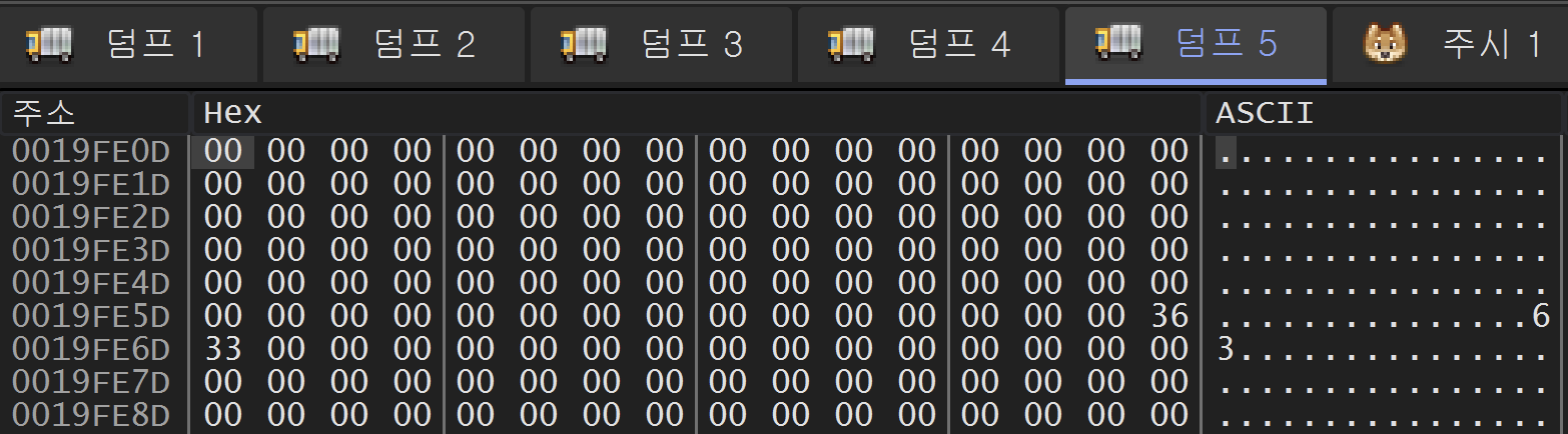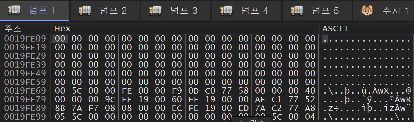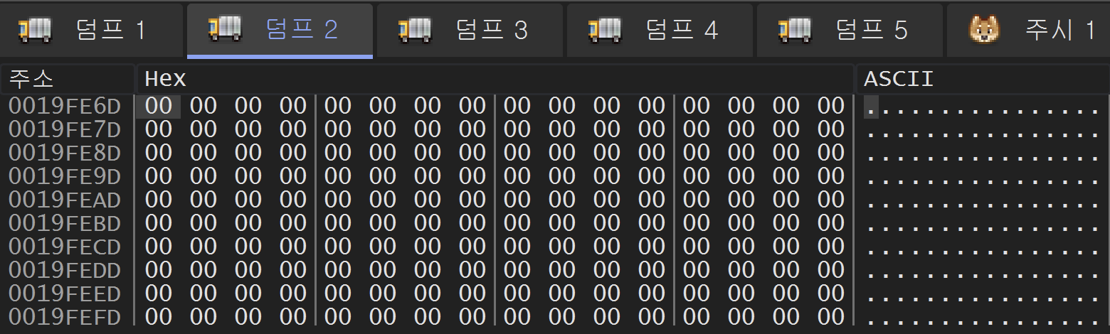40101E 주소의 rep stosd 명령을 실행한 후에는 위와 같이 19FE09 주소부터 19FE68 주소까지 0으로 채워졌다.