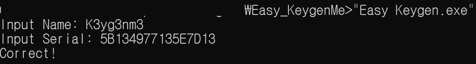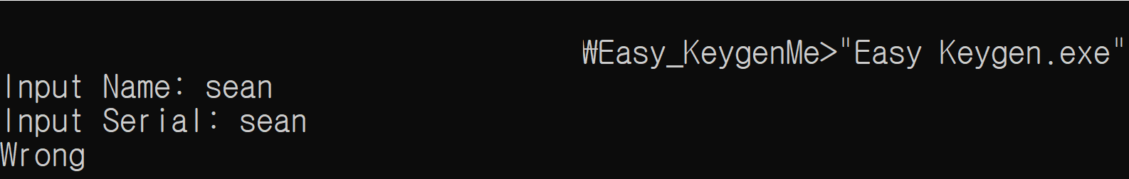 CMD에서 Keygen 파일을 실행한 후 Name과 Serial에 임의의 값을 입력하면 위와 같이 "Wrong"가 뜬다.