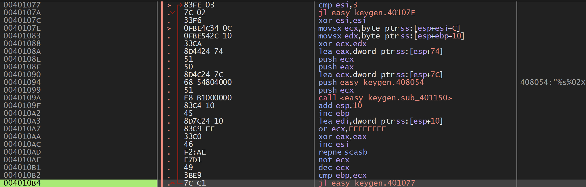 이렇게 위의 401077 주소부터 4010B4 주소까지가 사용자가 입력한 Name 값을 가지고 암호화 하는 부분이고, ebp의 값이 ecx보다 작을 때까지 총 3번 반복을 도는데, 40107E 주소에서 esp+esi+C의 값은 1번 째 루프에서는 10, 2번 째 루프에서는 20, 3번째 루프에서는 30이 되며, 401083 주소에서 esp+ebp+10의 값은 사용자가 입력한 값이다.