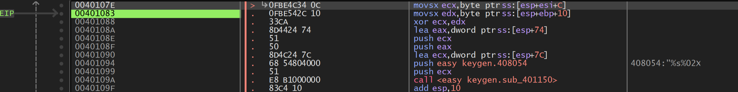 10과 73을 xor 연산하면 63이라는 결과가 나오는데, 스택에 ecx의 값 10, esp+74 주소, 408054 주소의 "%s%02x" 문자열, esp+7C 주소를 차례대로 넣고, 401150 주소의 함수를 호출한다.