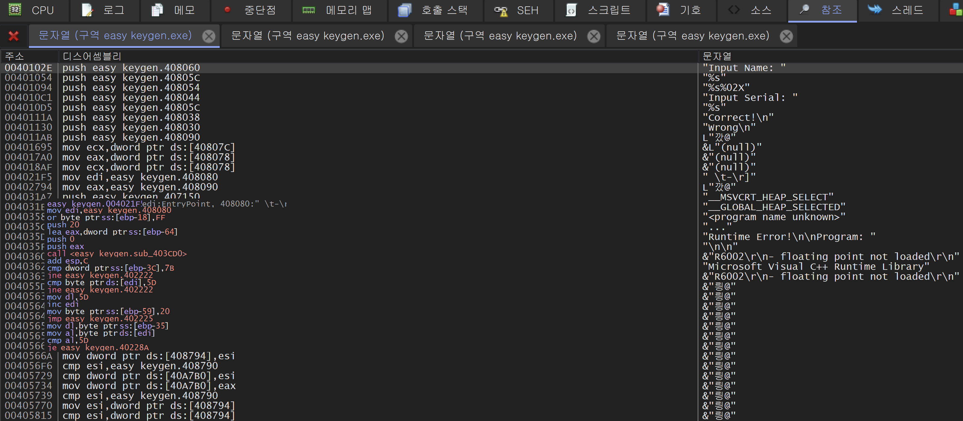 x32dbg의 문자열 검색 기능을 이용하면 위와 같이 문자열들이 나온다.