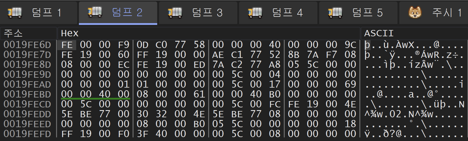 위는 401033 주소의 rep stosd 명령을 수행하기 전 esp+75(19FE6D) 주소 영역이다.
