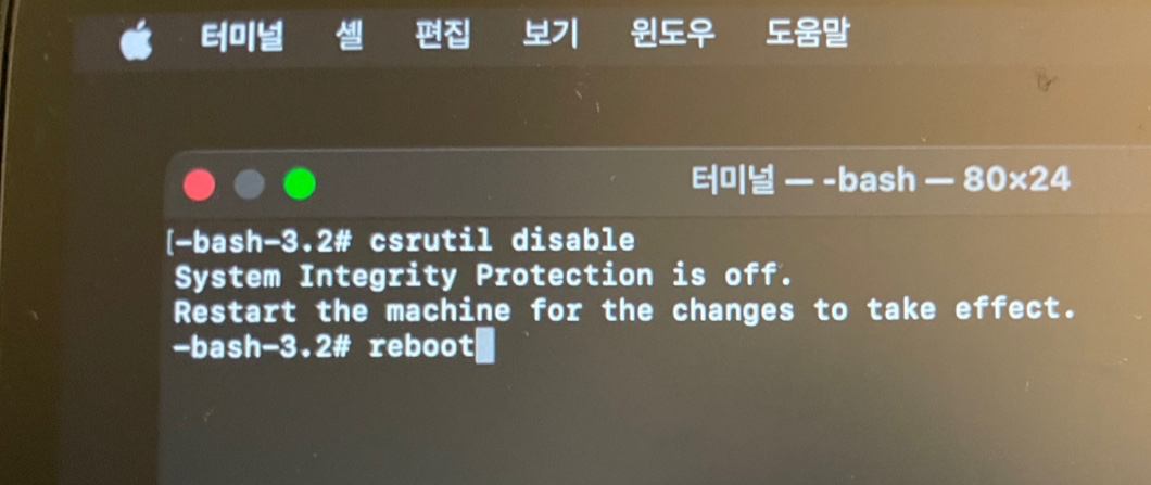 위의 두 개의 명령을 입력해 시스템 무결성 보호 기능을 비활성화 한 뒤 재부팅한다.