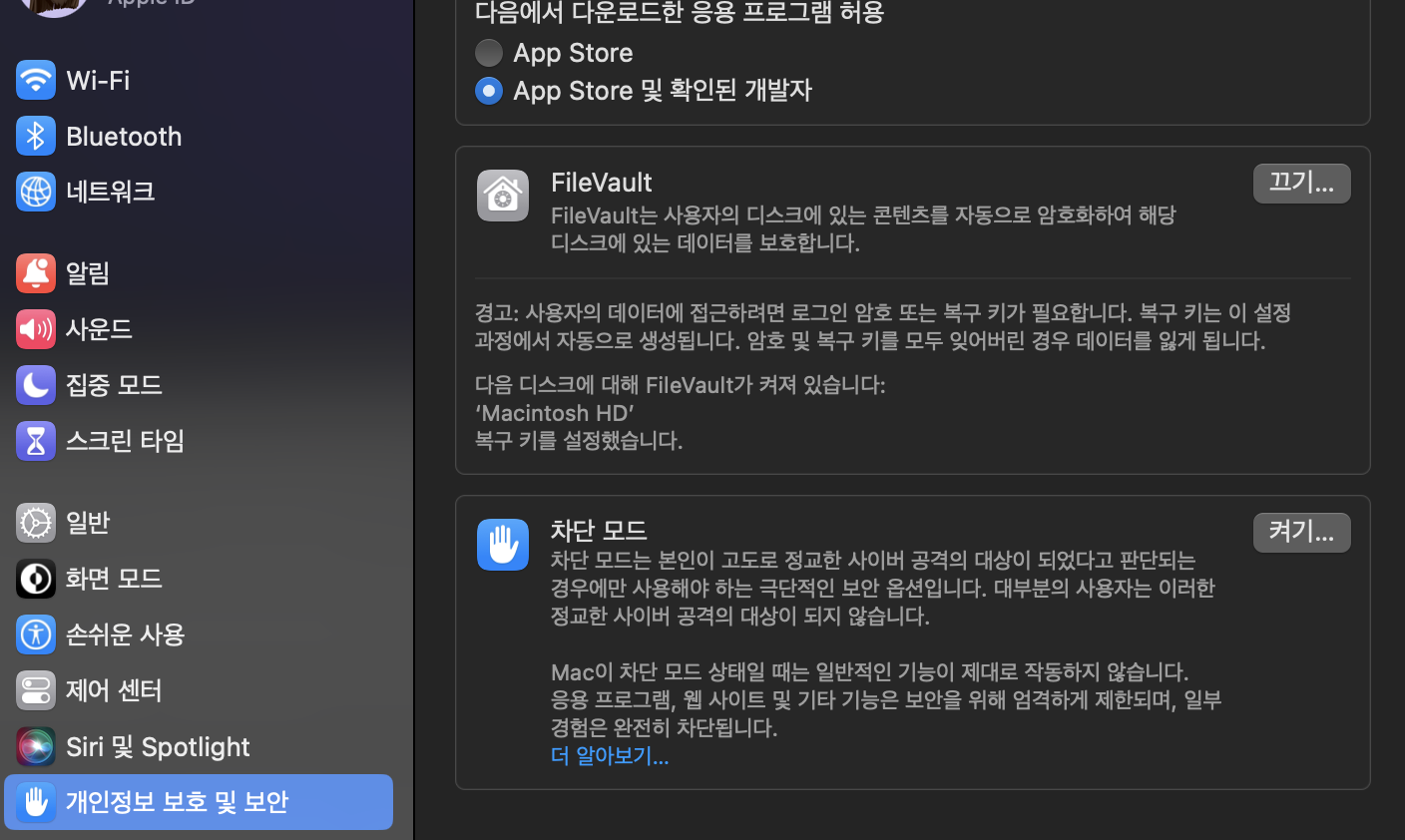 "시스템 환경설정" -> "개인정보 보호 및 보안"으로 들어와서 스크롤을 쭉 내리면 위와 같이 보이는데, "App Store"로 체크가 되어 있다면 "App Store 및 확인된 개발자"를 체크해준다.