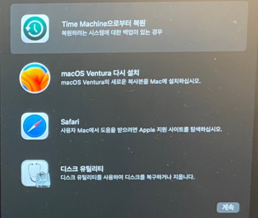 시스템을 종료한 뒤 전원 버튼을 눌러 켜자마자 동시에 Command + r 키를 누르고 있는다.