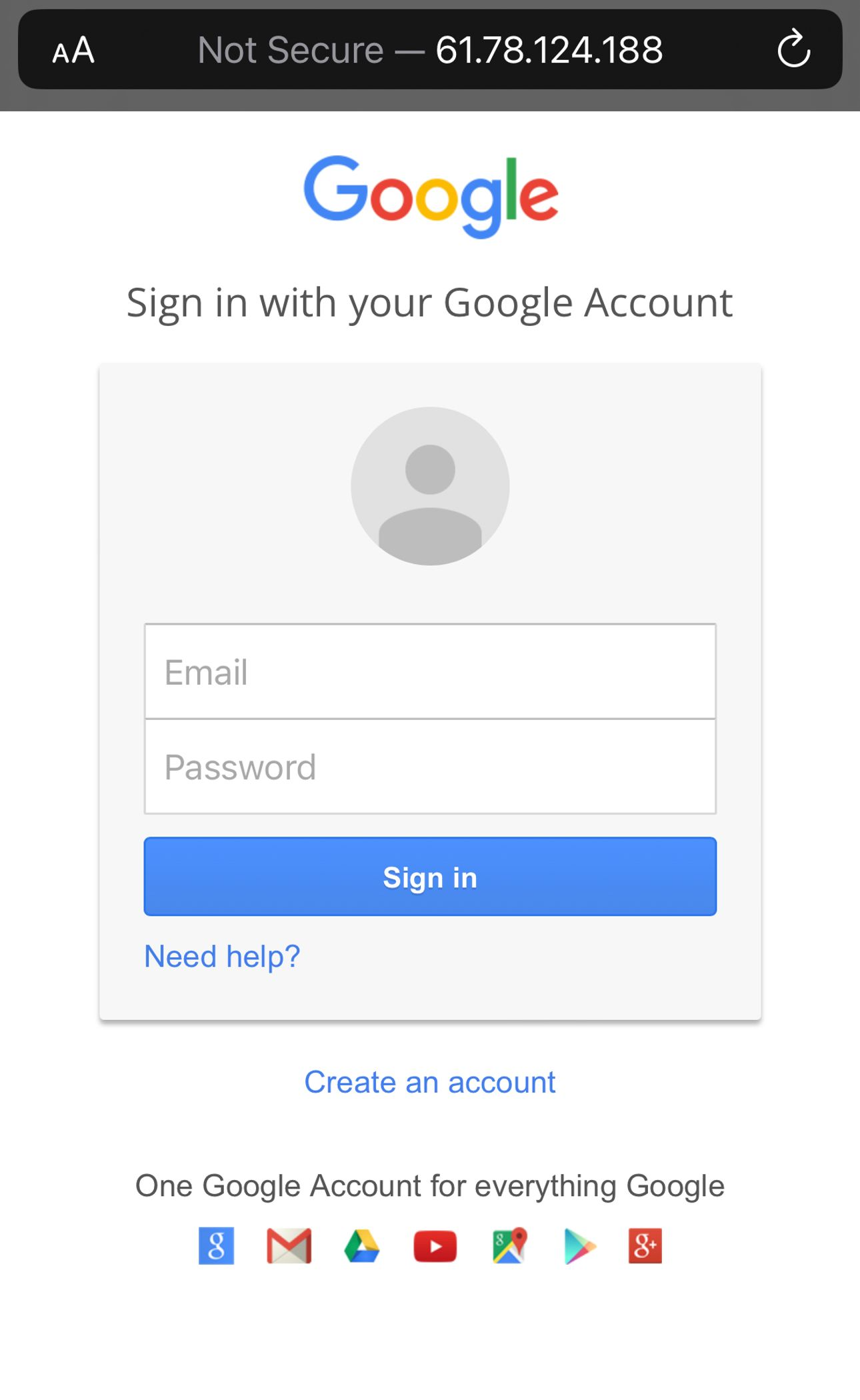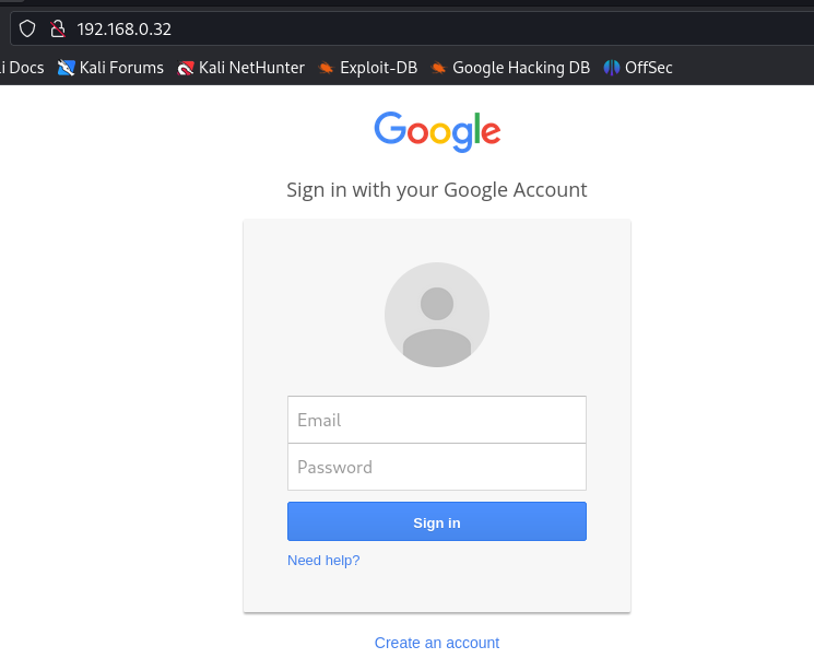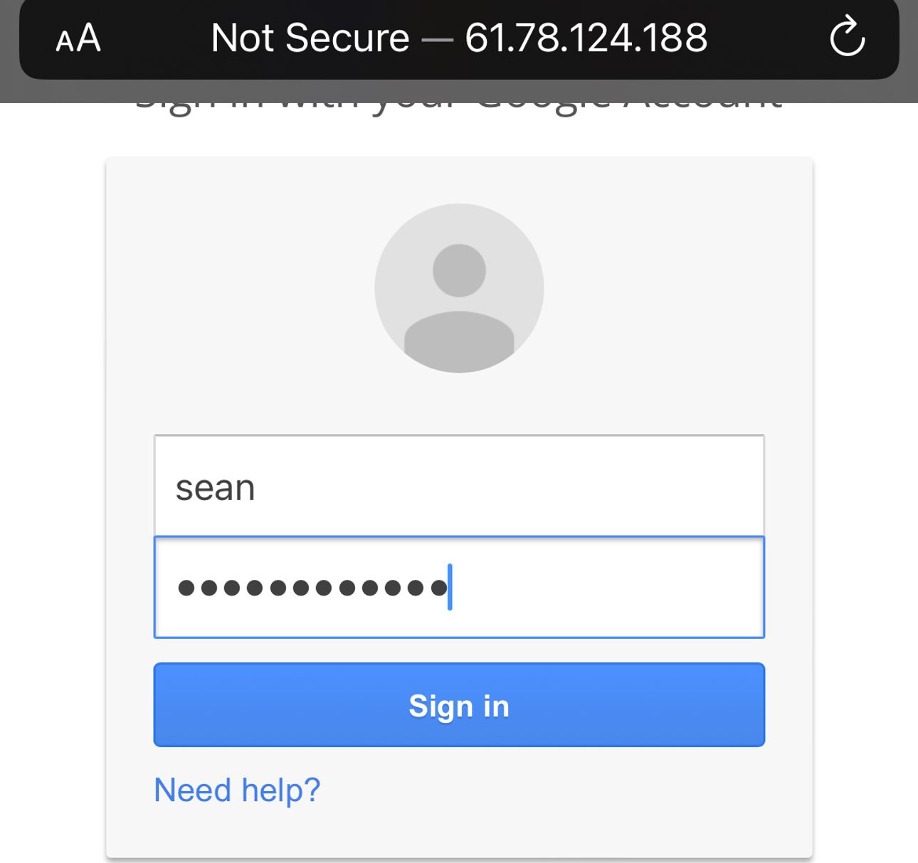 그리고 위와 같이 setoolkit에서 피싱 사이트와 연결한 IP 주소를 웹 브라우저를 통해 접속하면 구글 로그인 페이지가 뜬다.