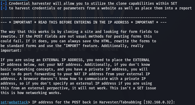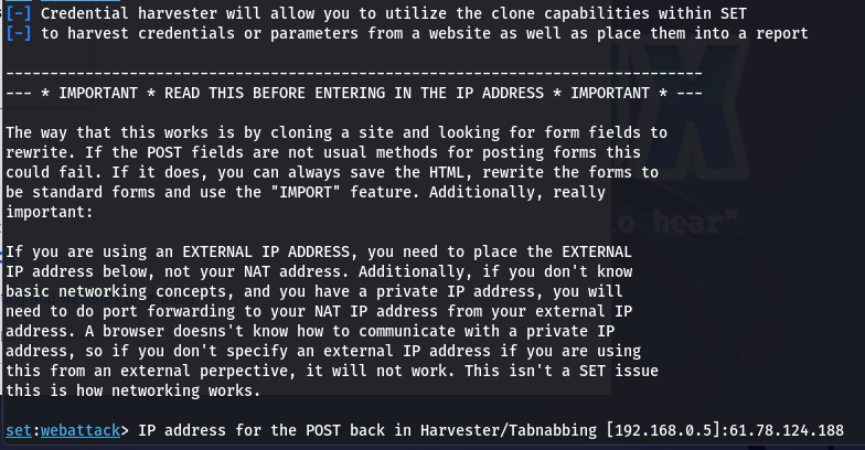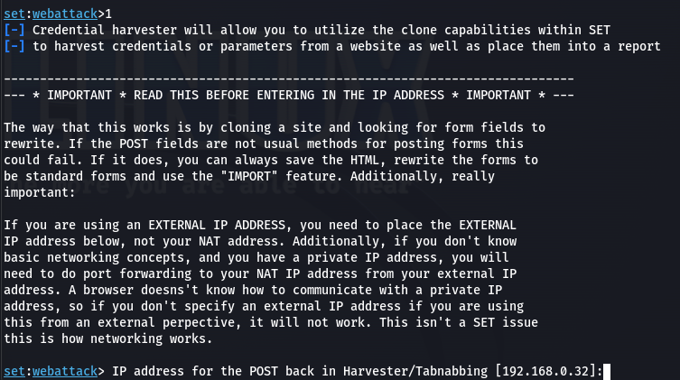 1번을 선택하면 위와 같이 피싱 사이트와 연결될 IP 주소를 입력하는데, 현재 자신의 kali linux에 할당된 IP 주소가 기본적으로 선택되어있고 화면에 표시된다.