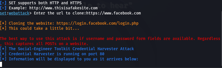 1) Social-Engineering Attacks -> 2) Website Attack Vectors -> 3) Credential Harvester Attack Method -> 1번 혹은 2번을 선택한다.