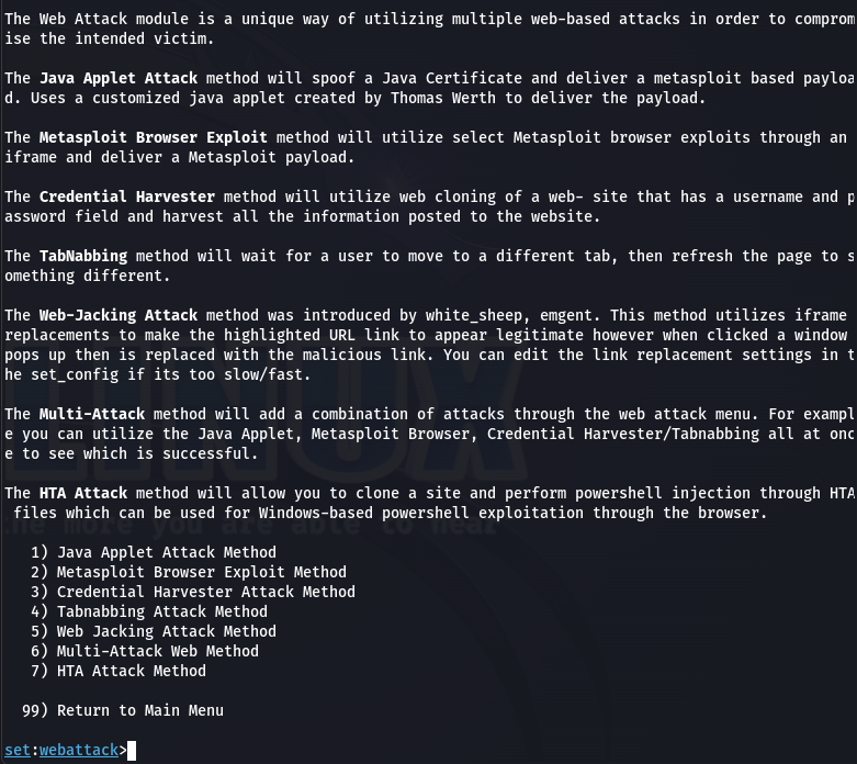 사회공학 기법 공격을 수행할 것이기 때문에 1번 Social-Engineering Attacks를 누른다.