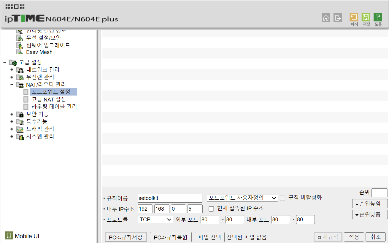 관리 도구 -> 고급 설정 -> NAT/라우터 관리 -> 포트포워드 설정