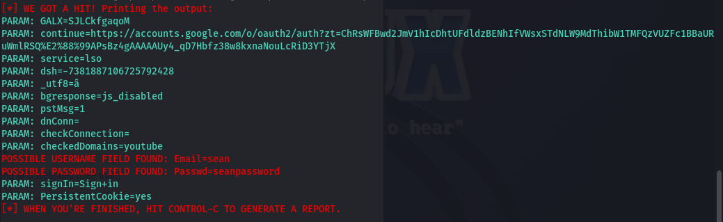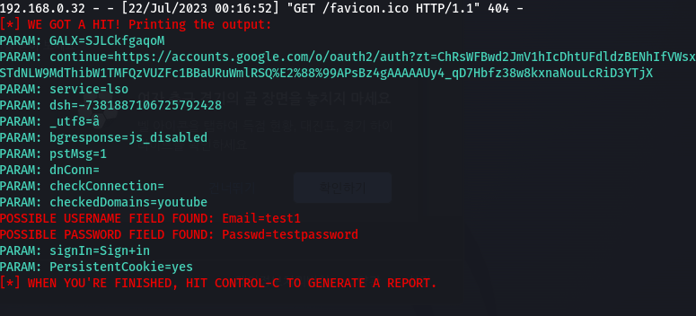 위와 같이 setoolkit에 타겟이 입력한 email 값과 passwd 값이 뜸으로써 정보를 획득할 수 있다.