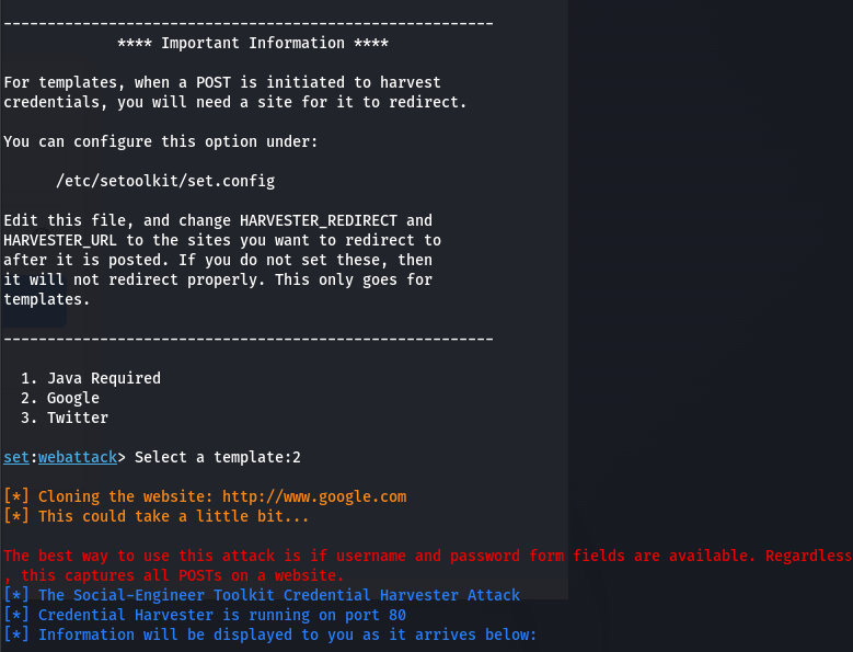 그러면 위와 같이 3개의 항목이 뜨는데, 구글 또는 트위터가 기본적으로 내장되어 있고, 2 또는 3을 입력하면 구글 피싱 사이트나 트위터 피싱 사이트가 생성된다.