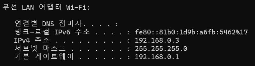 먼저 CMD(명령 프롬프트) 혹은 powershell에서 "ipconfig" 명령을 이용해 자신의 IP 주소의 게이트웨이를 확인한다.