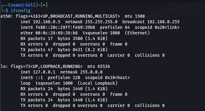 그리고 kali linux에서 "ifconfig" 명령을 이용해 현재 IP 주소를 확인한다.