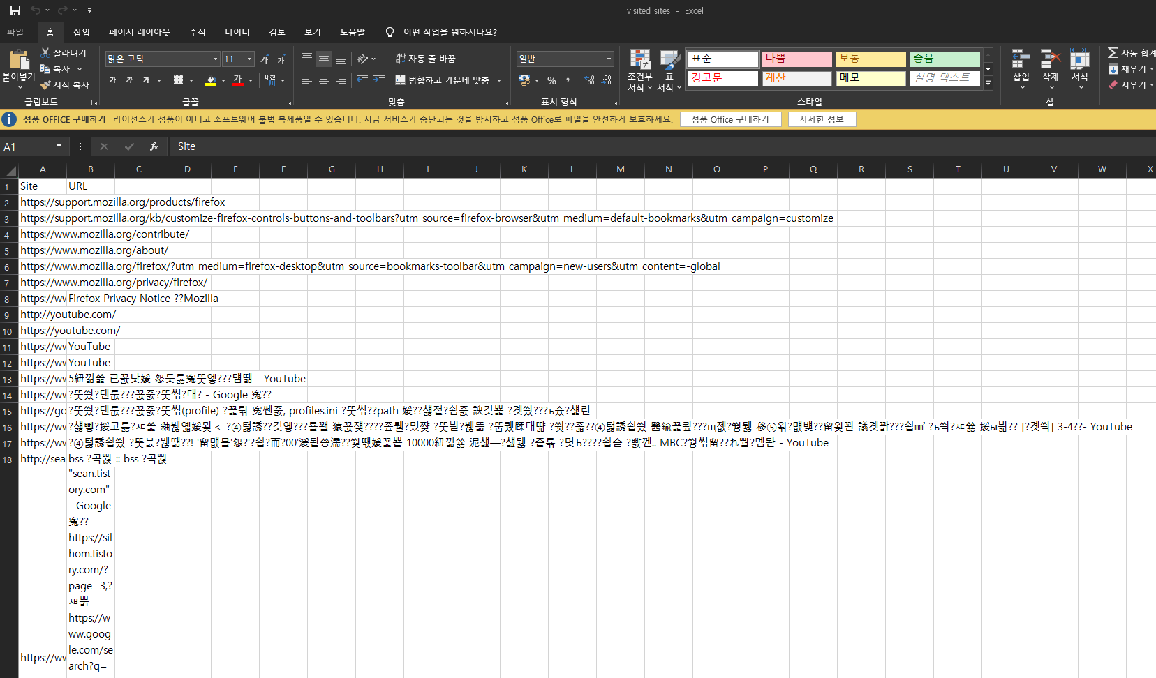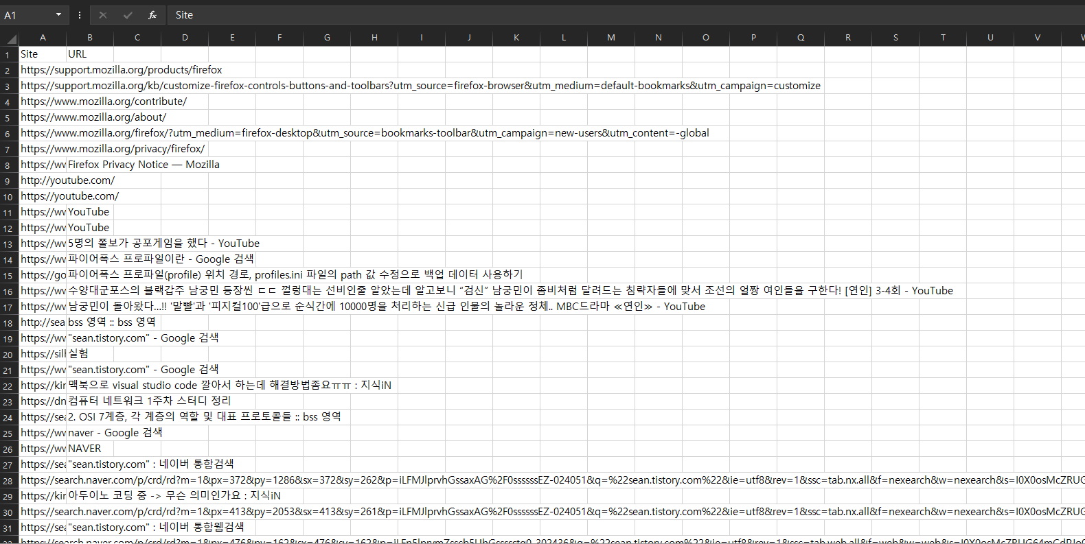 visited_sites.csv 파일로 만들어주도록 chatgpt에게 요청했었기 때문에 수집 결과를 csv 파일로 만들어줬다.