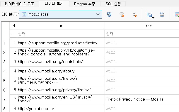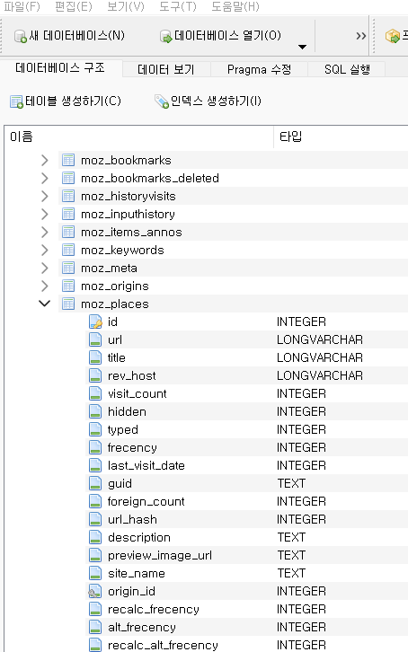 접속 기록은 places.sqlite 파일 내에 moz_places 테이블에서 확인할 수 있다.