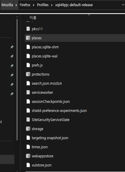 이외의 파일들은 C:\Users\<사용자 이름>\AppData\Roaming\Mozilla\Firefox\Profiles\.default-release 폴더 아래에서 확인할 수 있다.