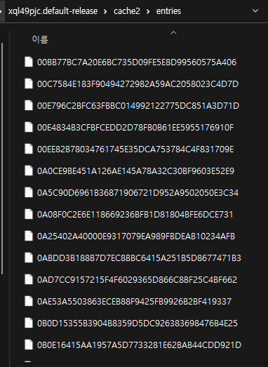 cache 파일들은 C:\Users\<사용자 이름>\AppData\Local\Mozilla\Firefox\Profiles\<random value>.default-release\cache2\entries 폴더 안에 있다.