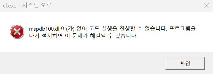 visual C 컴파일러 cl.exe를 실행하려고 할 때 위와 같이 mspdb100.dll과 관련해 에러 메시지 창이 뜬다면, mspdb100.dll 파일이 컴퓨터 시스템에 없거나 프로그램에서 해당 파일의 경로를 모르기 때문이다.