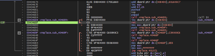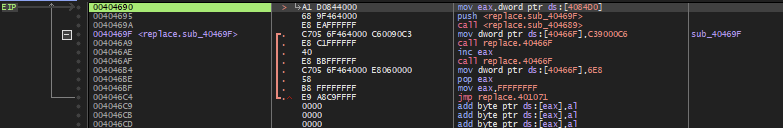4046AE 주소에서 eax에 들어있는 값을 1 증가시키고, 다시 40466F 주소의 함수를 호출하여 증가된 eax 값에 해당하는 주소에 90을 넣고