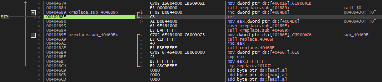 404689 주소에 있는 함수는 위에서도 언급했듯이 4084D0 주소에 있는 값을 증가시키는데, 이번에는 스택에 40469F 주소를 넣었기 때문에 한 번 증가시키고는 ret 명령에 의해 40469F 주소로 이동한다.