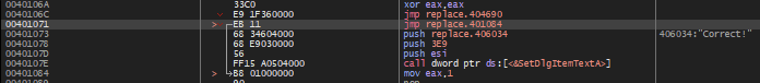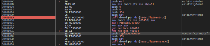 그러면 위와 같이 401073 주소에서 "Correct!" 문자열을 스택에 넣고 이어서 40107E 주소의 GetDlgItemTextA() API 함수를 통해 출력하는 것 같은데, 문제는 401073 주소로 조건 분기하는 부분이 없다는 것이다.