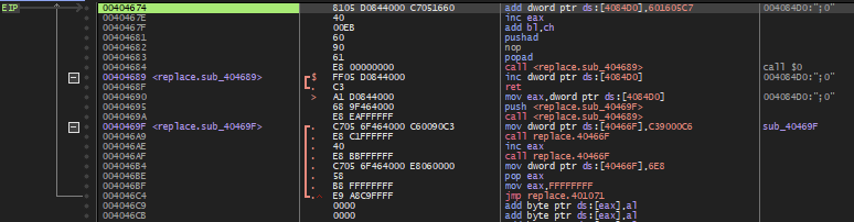 그리고는 404674 주소로 ret 명령에 의해 점프하게 되는데, 여기서는 4084D0 주소에 있는 값에 601605C7 값을 더한다.