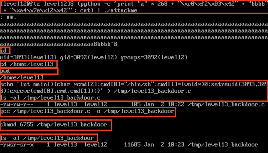 실제 서버라면 취약점이 패치될 수도 있고, 재부팅 등으로 서버의 환경이 바뀐 경우에 바이너리를 다시 분석해서 덮어써야 할 정확한 주소를 파악하는 등의 번거로움이 발생하므로 간단하게 level13 권한을 얻을 수 있는 백도어를 심어두는 것이 좋다.
