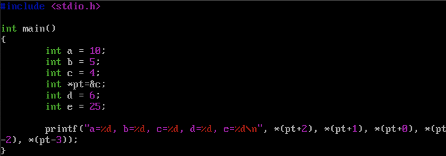 printf("a=%d, b=%d, c=%d, d=%d, e=%d\n", *(pt+2), *(pt+1), *(pt+0), *(pt-2), *(pt-3));