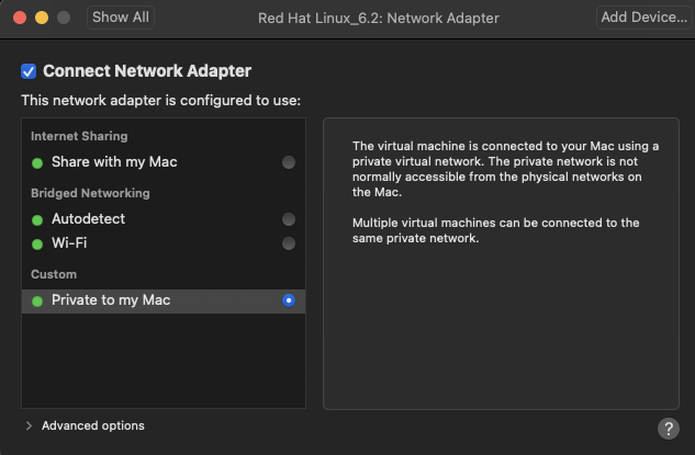 MacOS의 VMware Fusion에서는 Private to my Mac이 host-only 역할과 같은 것이다.